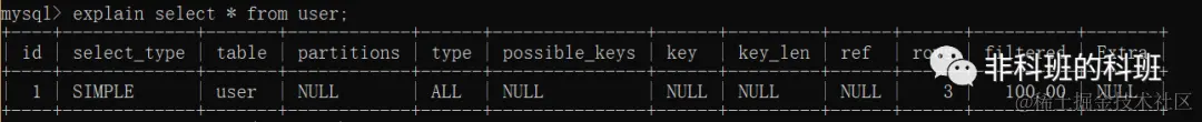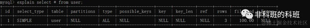 | 1 | SIMPLE | user | NULL | ALL | PRIMARY | NULL | NULL | NULL | 3 | 100.00 | NULL |