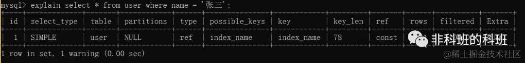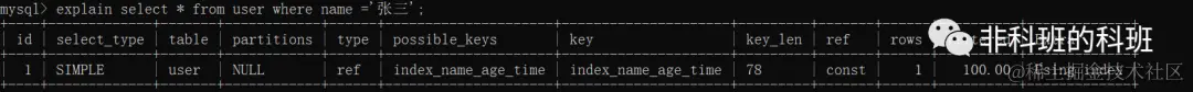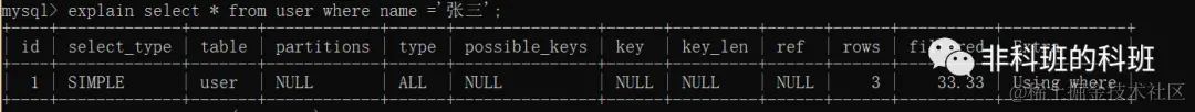 (1)通过查询 explain select * from user where name ='张三';name字段并没有创建索引。