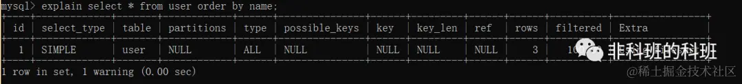 Using filesort表示文件排序,说明Mysql对数据使用了外部的索引进行排序,并没有使用表中的索引进行排序:explain select * from user order by name;
