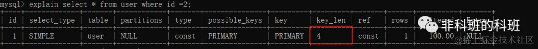 一般来说在不损失精度的前提下,key_len是越小越好,比如上面的测试表的id为int类型,int类型由4个字节组成:explain select * from user where id =2;