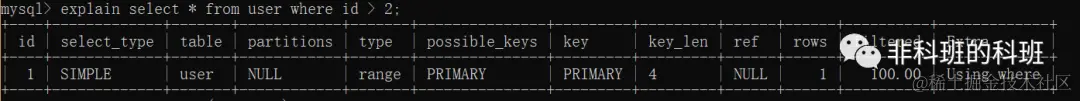 「range使用索引来检索给定范围的行数据,一般是在where后面使用between、<>、in等查询语句就会出现range」:explain select * from user where id > 2;