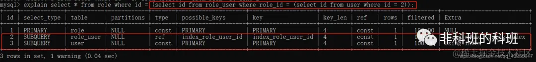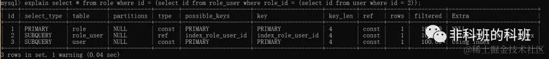 复杂查询中**「最外层的select语句的查询类型就是PRIMARY」**,例如执行下面的sql:explain select * from role where id = (select id from role_user where role_id = (select id from user where id = 2));