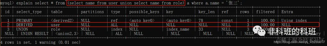 「DERIVED表示的是派生表或者衍生表的意思,在from包含的子查询中会被表示为DERIVED类型」,Mysql会递归执行这些子查询,并且把结果放在临时表中。执行sql:explain select * from (select name from user union select name from role) a where a.name = '张三';