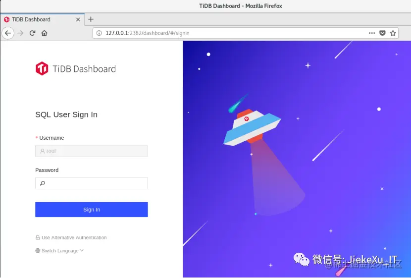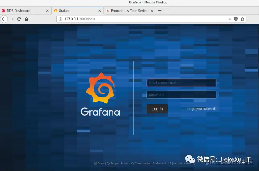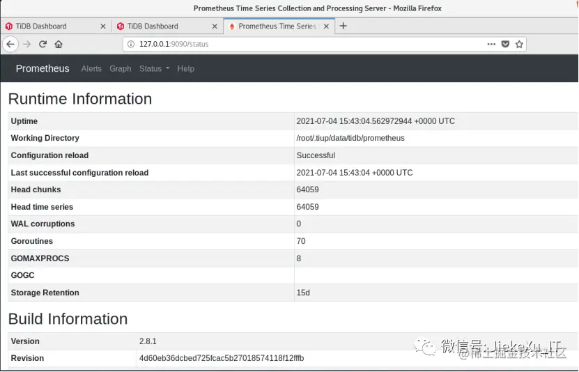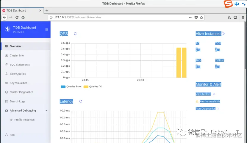 除了连接还可以登录监控系统,通过虚拟机图形界面打开火狐,通过 http://127.0.0.1:9090 访问 TiDB 的 Prometheus 管理界面。通过 http://127.0.0.1:2379/dashboard 访问 TiDB Dashboard 页面,默认用户名为 root,密码为空。