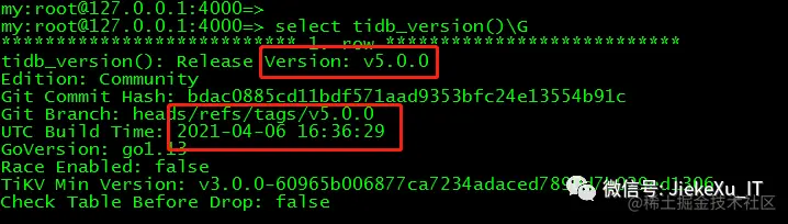 Server version: 5.7.25-TiDB-v5.0.0 TiDB Server (Apache License 2.0) Community Edition, MySQL 5.7 compatible