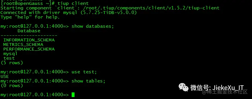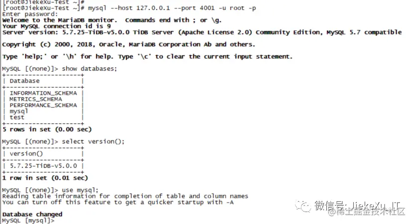 [root@JiekeXu-Test ~]# mysql --host 127.0.0.1 --port 4001 -u root -p