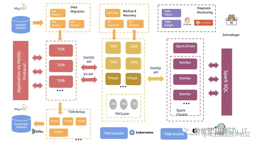 TiDB 是平凯星辰 PingCAP 公司自主设计、研发的开源分布式关系型数据库,是一款同时支持在线事务处理与在线分析处理 (Hybrid Transactional and Analytical Processing, HTAP) 的融合型分布式数据库产品,具备水平扩容或者缩容、金融级高可用、实时 HTAP、云原生的分布式数据库、兼容 MySQL 5.7 协议和 MySQL 生态等重要特性。更是墨天轮排行榜第一的国产数据库,可点击此处查看本月国产数据库排行榜。TiDB 的目标是为用户提供一站式 OLTP (Online Transactional Processing)、OLAP (Online Analytical Processing)、HTAP 解决方案。TiDB 适合高可用、强一致要求较高、数据规模较大等各种应用场景。今年四月份发布了 5.0 版本,六月二十四日又发布了 TiDB 5.1 版本,核心架构图如下: