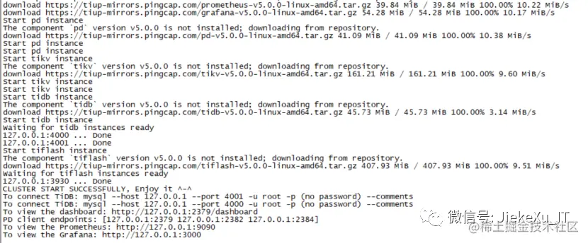 [root@JiekeXu-Test ~]# tiup playground v5.0.0 --db 2 --pd 3 --kv 3 --monitor