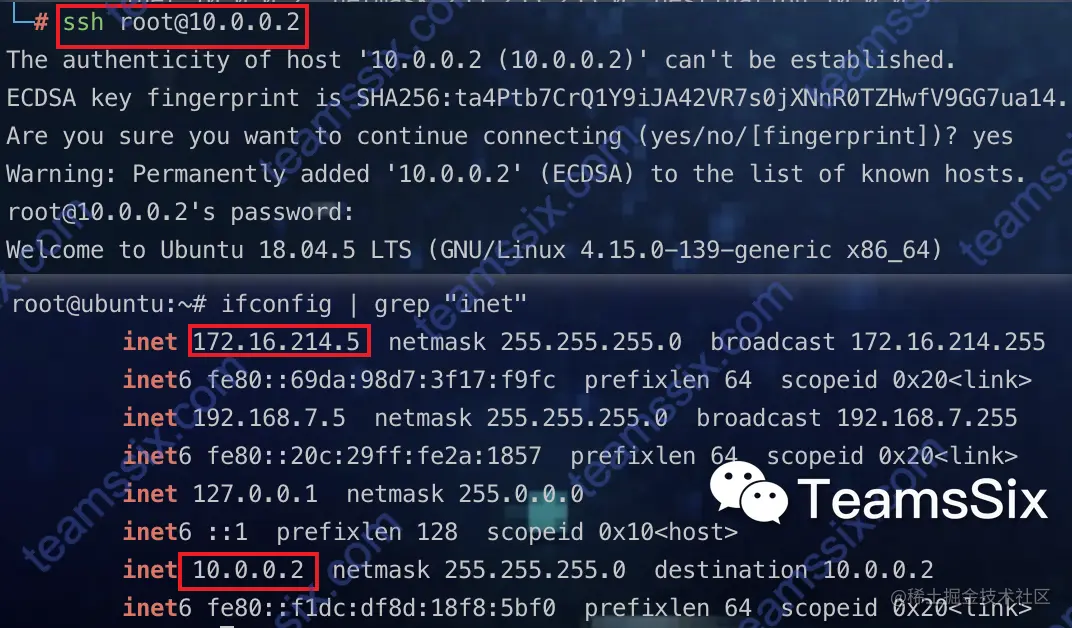 在攻击机上,尝试通过 ssh 进行连接,可以看到通过刚才建立的隧道成功连接到目标机。