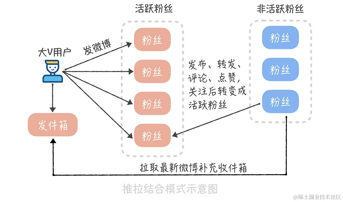 拉模式彻底解决了推送延迟的问题,大 V 发微博的时候不再需要推送到粉丝的收件箱,自然就不存在延迟的问题了\