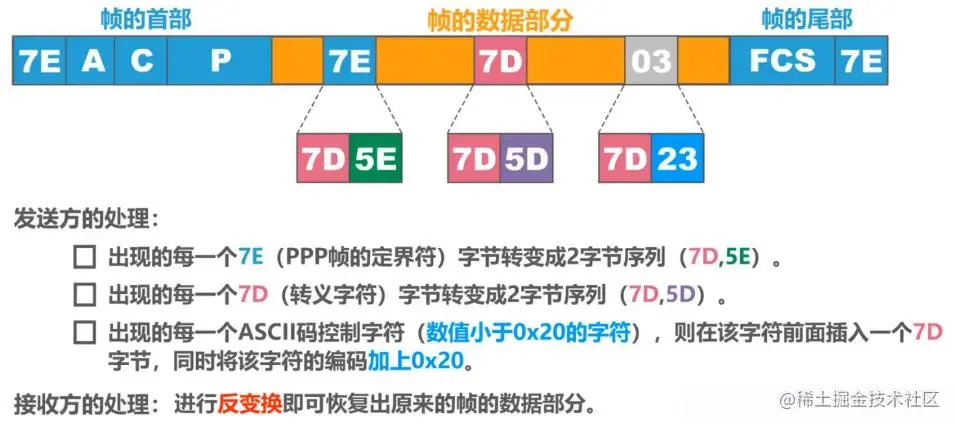 - (1)把信息字段中出现的每一个0x7E字节转变为2字节序列(0x7D,0x5E)。