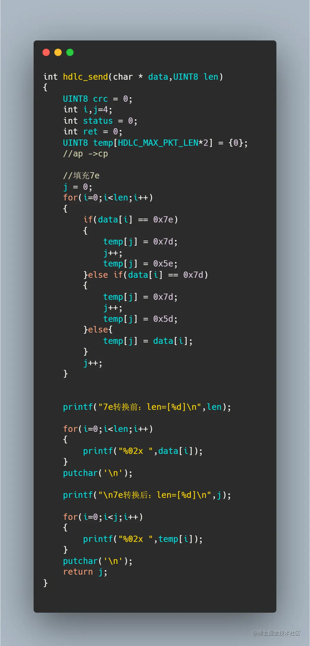 首先看下如果下发数据帧,如何将所有的7e和7d做替换: 函数hdlc_send(char * data,UINT8 len)实现如下:
