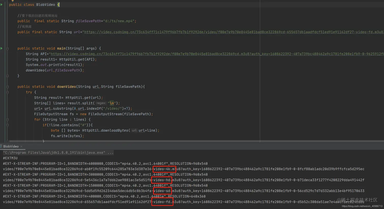 4.用上个请求地址(截取到最后一个“/”)拼接你想要下载的分辨率的视频源地址,放入url变量中,code如下