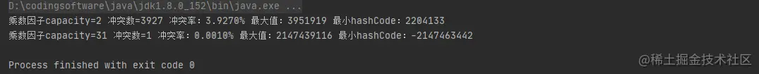 System.out.println(String.format("乘数因子capacity=%d 冲突数=%d 冲突率:%.4f%% 最大值:%d 最小hashCode:%d",