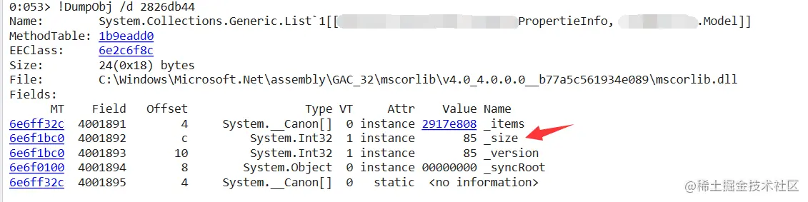 按照以往经验,应该是从数据库中获取了过多数据导致,那本次dump是不是呢?要想寻找答案, 先用 !dso 命令导出线程栈所有变量,然后用 !do xxx 查看 List<xxxPropertieInfo> list 的size,如下图所示:
