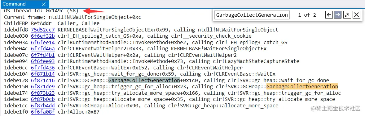 看到上面的 SuspendEE 的吗,它的全称就是 Suspend CLR Execute Engine,接下来我们用 ~*e !dumpstack 看看哪一个线程触发了 CLR 中的 GarbageCollectGeneration 方法。