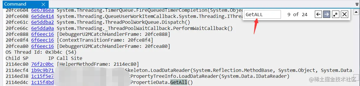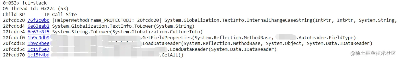 从图中可以看到是 53 号线程触发了,切到53号线程后换用 !clrstack。