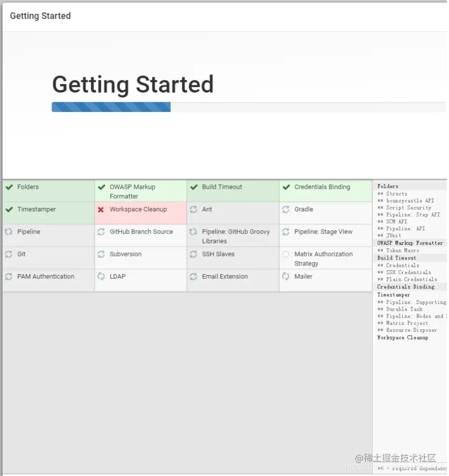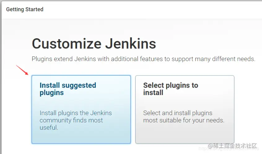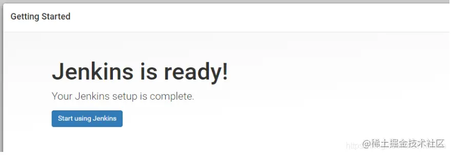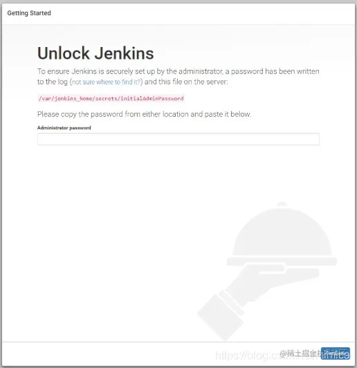 出现该图表示Jenkins已经启动成功,等待初始化,需要查找到管理员的初始密码填写入该地址栏即可开始初始化。
