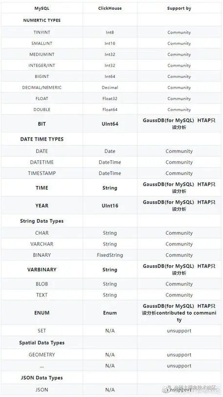 MySQL 和 ClickHouse 的基本数据类型之间都有对应的映射关系(见下表),值得一提的是 ClickHouse 将不支持的 MySQL 数据类型都转换为 String 类型存储。MySQL 不支持的 ClickHouse 类型也都被转换为 MYSQL_TYPE_STRING 类型。从下表中不难看出,ClickHouse 仍有一部分数据类型还未支持,而这部分数据类型在实际应用场景中是有可能出现的,因此 GaussDB(for MySQL) HTAP只读分析针对常用的数据类型例如 BIT 和 TIME 以及 YEAR 等做了适配,解决部分用户的刚要需求。