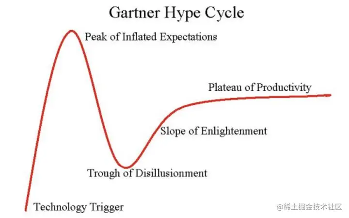 如果我们不分数字化技术的门类,讲整个市场的话,特别是toB市场,数字化进程会是比较平缓的增长曲线;增长趋势是明确的,不可能有剧烈波动。在未来10年-20年时间,可能持续保持这样一个趋势,但是落到现在的每个细分市场、不同门类的市场,波动就会比较剧烈,所以Gartner(全球权威IT市场研究与咨询公司)有一个成熟度曲线。