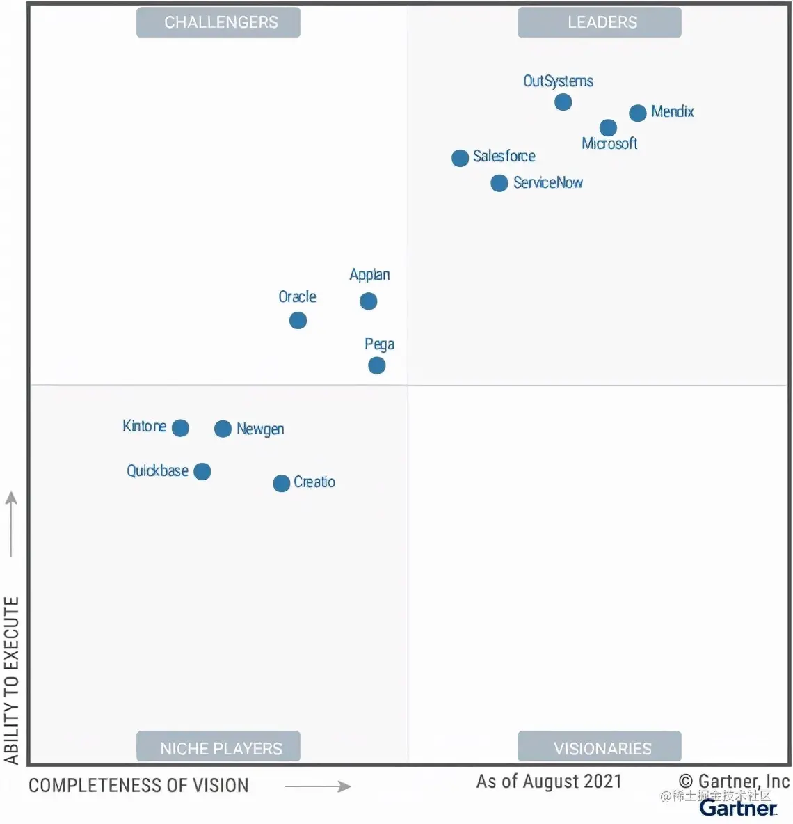 - 其中,OutSystems、Mendix、微软、Salesforce、ServiceNow被评为行业领导者;