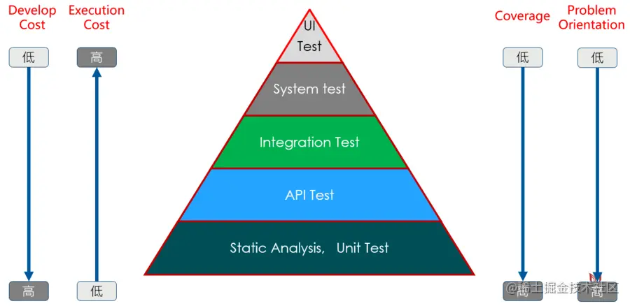 回到测试金字塔,从测试的"开发成本"、“执行成本”、“测试覆盖率”、“问题定位”四个维度来看,基于代码级别的白盒测试是及其重要的。