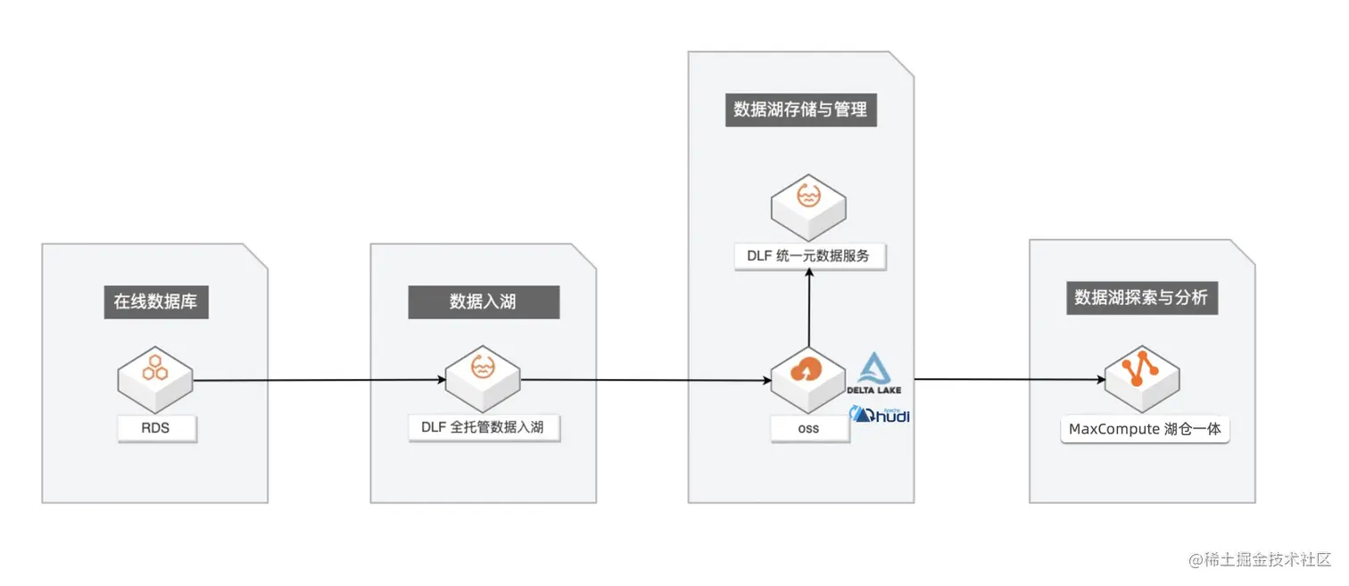 企业构建和应用数据湖一般需要经历数据入湖、数据湖存储与管理、数据探索与分析等几个过程。主要介绍基于阿里云 MaxCompute、数据湖构建(DLF)+ 对象存储(OSS)构建一站式的数据入湖与分析实战。其主要数据链路如下: