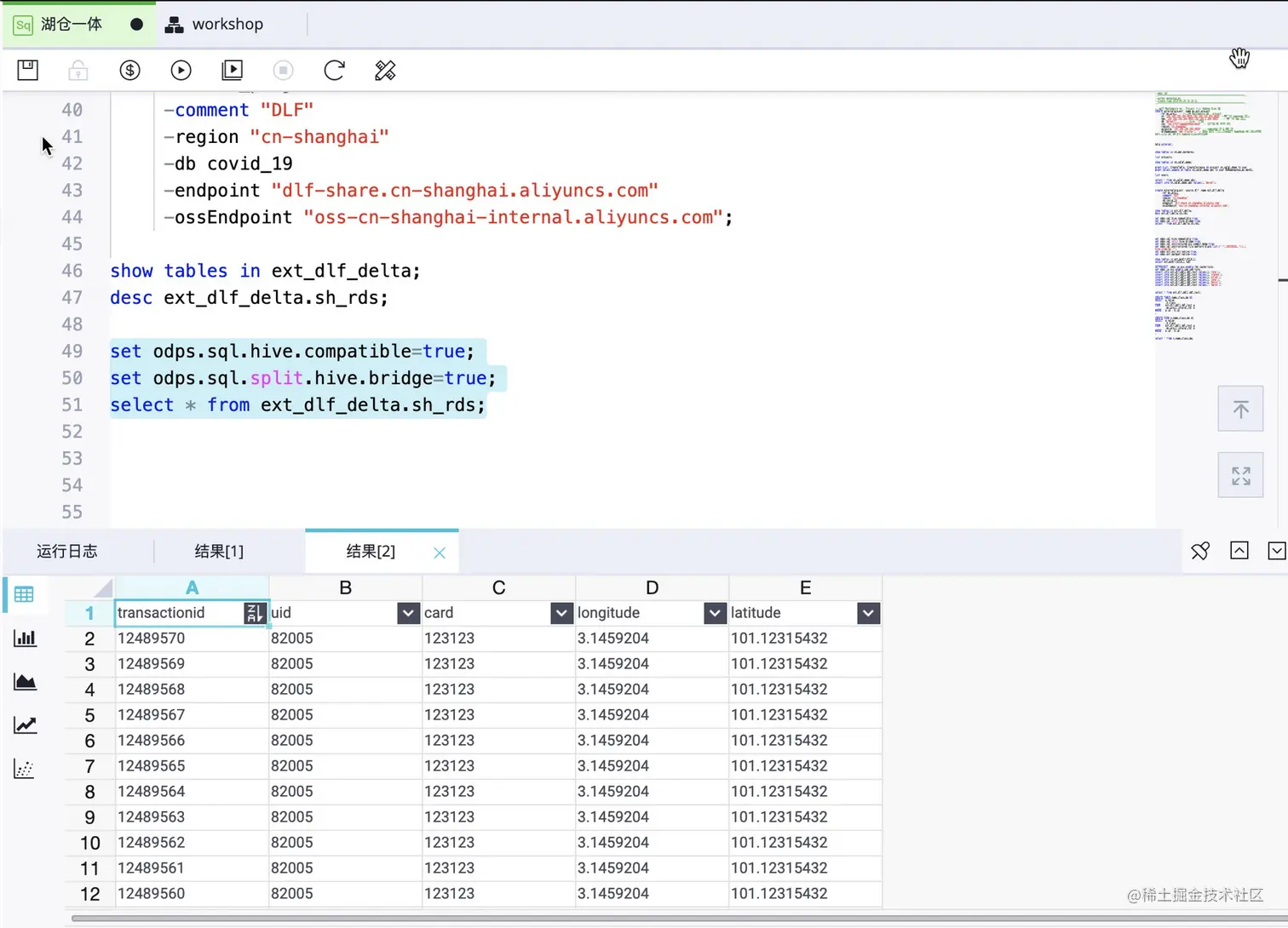 set odps.sql.hive.compatible=true; set odps.sql.split.hive.bridge=true; select * from ext_dlf_delta.sh_rds;