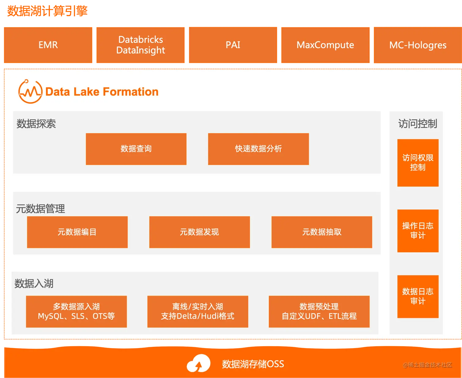 DLF主要是针对OSS数据,做一个托管,上层对接其他引擎如EMR、Databricks、Datalnsight、PAI、MaxCompute、Hologres。这些引擎可以共享一份元数据在DLF上。后续企业可以根据不同部门,不同业务场景随意切换引擎。后期我们也会逐渐完善访问控制,以及一些企业级能力,比如安全,包括数据分层等。