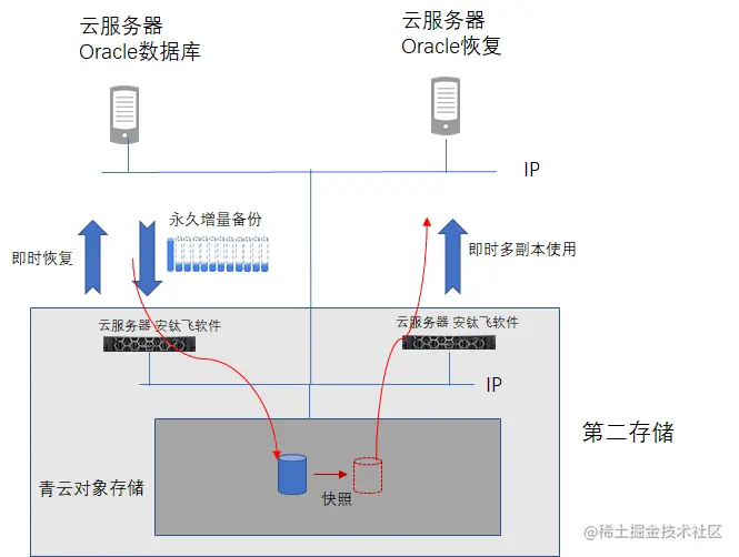 通过第二存储,可以完美解决业界一直存在的容灾建设在成本和效果之间的矛盾,各种机房内的高概率小故障,由本地的第二存储快速解决,无需切换到容灾端(当然,传统的容灾系统也无法有效的解决这些小故障)。在日常,云端只需要租赁对象存储资源,只有发生概率很小的整体机房故障时,才临时申请服务器、存储、网络等资源,实现容灾切换。