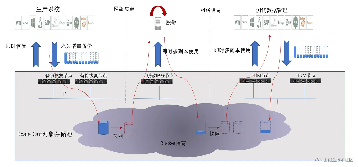 第二存储采用了 CDM 作为备份的技术,同时,也利用数据的分布式架构,实现了数据的统一存储、管理、恢复、使用等等,消除了传统备份的孤岛式架构。
