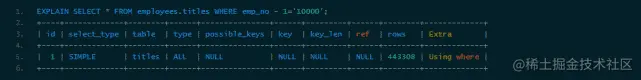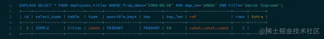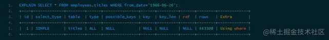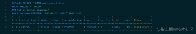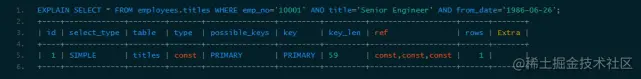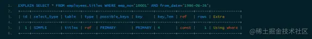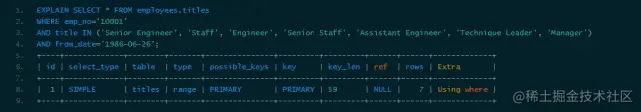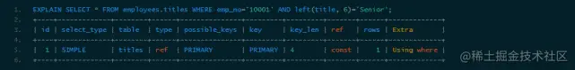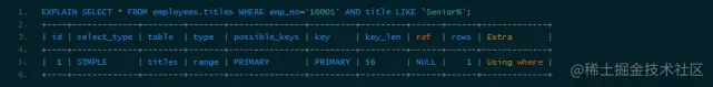 此时索引使用情况和情况而相同,因为title未提供,所以查询只用到了索引的第一列,而后面的from_date虽然也在索引中,但是由于title不存在而无法和左前缀连接,因此需要对结果进行扫描过滤from_date(这里由于emp_no唯一,所以不存在扫描)。如果想让from_date也使用索引而不是where过滤,可以增加一个辅助索引<emp_no, from_date>,此时上面的查询会使用这个索引。除此之外,还可以使用一种称之为“隔离列”的优化方法,将emp_no与from_date之间的“坑”填上。