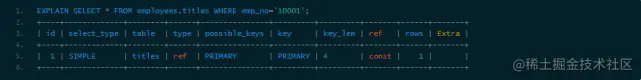 当查询条件精确匹配索引的左边连续一个或几个列时,如<emp_no>或<emp_no, title>,所以可以被用到,但是只能用到一部分,即条件所组成的最左前缀。上面的查询从分析结果看用到了PRIMARY索引,但是key_len为4,说明只用到了索引的第一列前缀。
