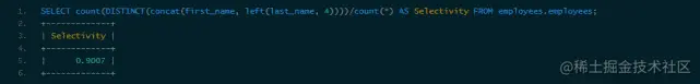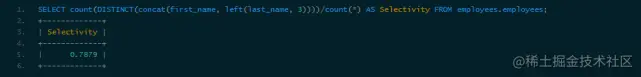 <first_name>显然选择性太低,<first_name, last_name>选择性很好,但是first_name和last_name加起来长度为30,有没有兼顾长度和选择性的办法?可以考虑用first_name和last_name的前几个字符建立索引,例如<first_name, left(last_name, 3)>,看看其选择性:
