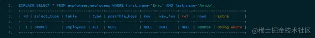 从图12可以看到employees表只有一个索引<emp_no>,那么如果我们想按名字搜索一个人,就只能全表扫描了: