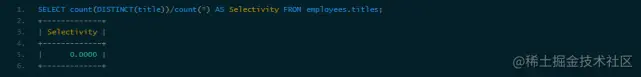 显然选择性的取值范围为(0, 1],选择性越高的索引价值越大,这是由B+Tree的性质决定的。例如,上文用到的employees.titles表,如果title字段经常被单独查询,是否需要建索引,我们看一下它的选择性: