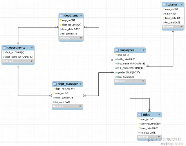 为了讨论索引策略,需要一个数据量不算小的数据库作为示例。本文选用MySQL官方文档中提供的示例数据库之一:employees。这个数据库关系复杂度适中,且数据量较大。下图是这个数据库的E-R关系图(引用自MySQL官方手册):