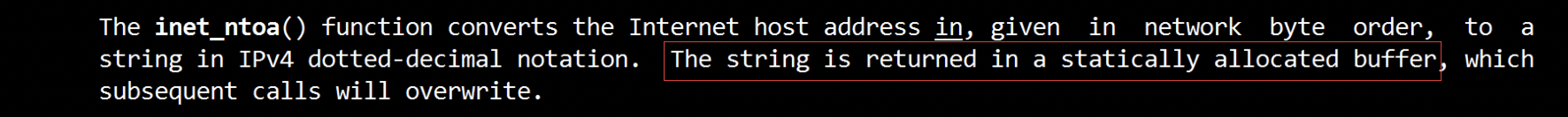 man手册上说, inet_ntoa函数, 是把这个返回结果放到了静态存储区. 这个时候不需要我们手动进行释放.