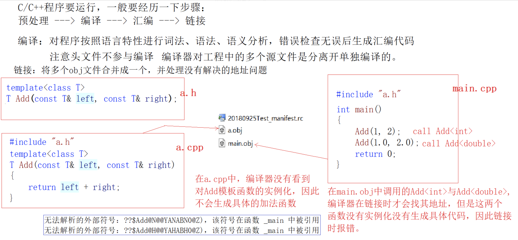 假如有以下场景,模板的声明与定义分离开,在头文件中进行声明,源文件中完成定义: