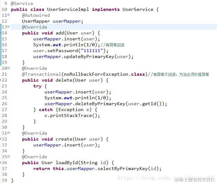 第29-31行:设置事务的传播机制为 PROPAGATION_REQUIRED,且为只读事务。这里与以前在SpringMVC通过XML方式整合mybatis是有点不一样,在XML里时为<tx:method name="load*" propagation="SUPPORTS" read-only="true"/>,转播机制为SUPPORTS,是可以为只读事务的,而在这里将传播机制设为 PROPAGATION_SUPPORTS,只读事务不起作用,原因我没有去查,如果有哪位同学知道,请告诉我。
