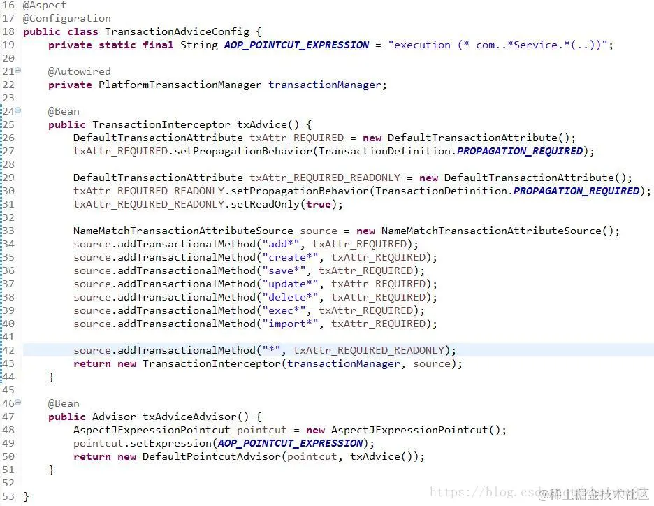 第33-42行:设置服务层每个方法名的不同事务机制,这样做有几点好处,