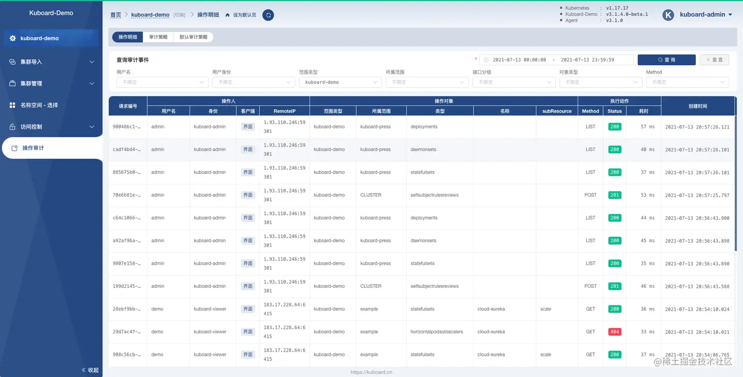 * 审计用户通过 Kuboard 界面和 Kuboard API 执行的操作;