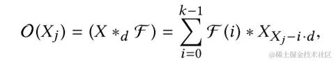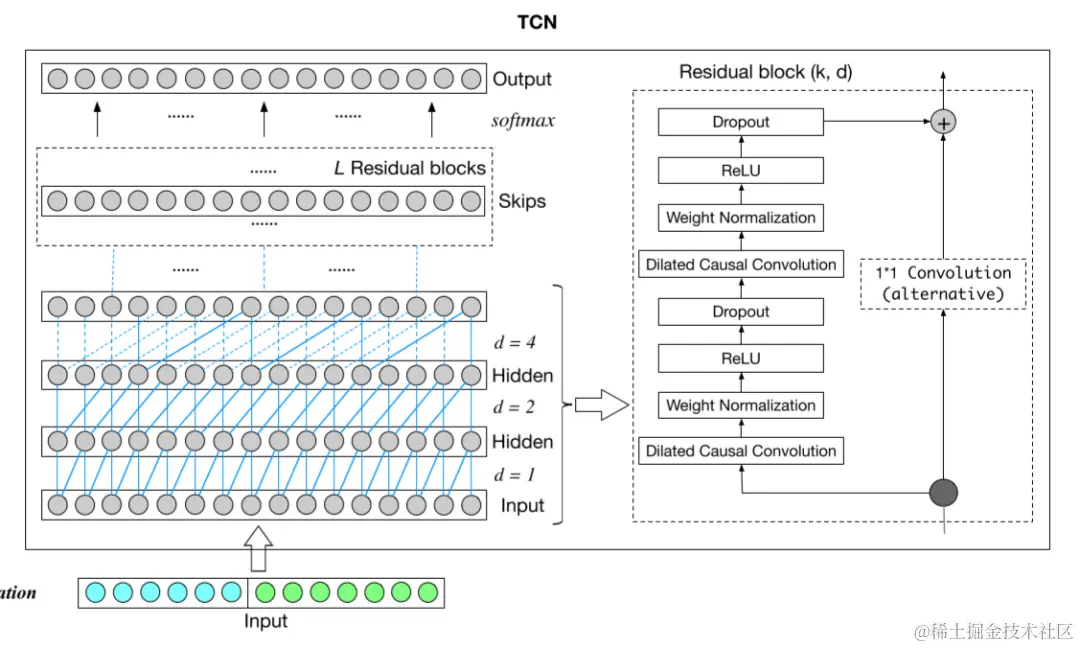 除此之外,考虑到网络的深层结构以及长期依赖关系,常用于卷积结构中的技术像空洞卷积(dilated convolutions)和残差连接(residual connections)。其中,对于一个一维输入序列 和一个滤波器 来说,对序列中的 个元素的空洞卷积操作即是: