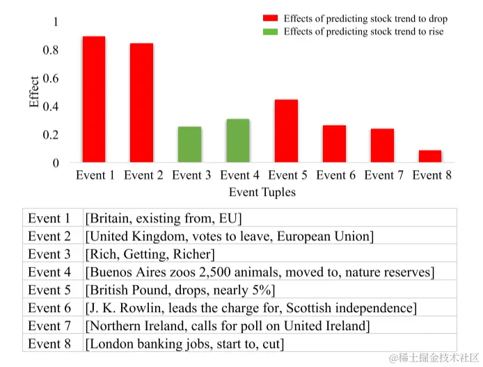 下图展示了将事件元组链接到知识图的可视化的一个例子。图中解释了知识驱动事件如何作用于股票的波动,以及为什么知识驱动模型是有效的。此外,通过结合对事件效应的解释,文章证明了知识驱动的事件是突变的常见来源。