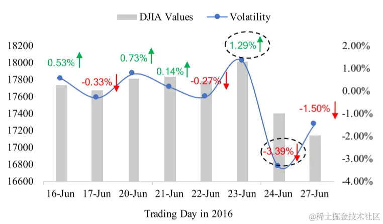 对于第一个问题,股票趋势的突变指的是股票价格在极短的时间内发生剧烈的变动,如下图的道琼斯工业指数在2016/6/23日上涨1.29%,然后6/24日暴跌3.39%。因此,面对这样的突变时,仅仅只通过股票价格数据是不充足的,并且股票价格的变动是随着事件或者新闻而发生的。