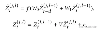 其中,由于因果卷积只作用域两个时间戳,所以滤波器的权重可通过两个权重矩阵表示,即上式中的 和 , 和 分别表示残差块之间的权重矩阵和偏置项。