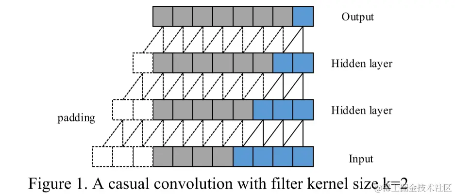 因此,TCN有两个主要约束:网络的输出应该与其输入具有相同的长度,并且网络只能使用过去时间步长的信息。为了满足这些时间性原则,TCN中使用了一个1维全卷积网络结构,即它的所有卷积层具有相同的长度,并带有零填充,以确保更高的层与之前的层相同的长度。此外,TCN使用因果卷积,即每一层的时间步长t的输出只计算不晚于前一层时间步长t的区域,如下图所示。对于一维数据,通过将常规卷积的输出移动几个时间步长,可以很容易地实现因果卷积。
