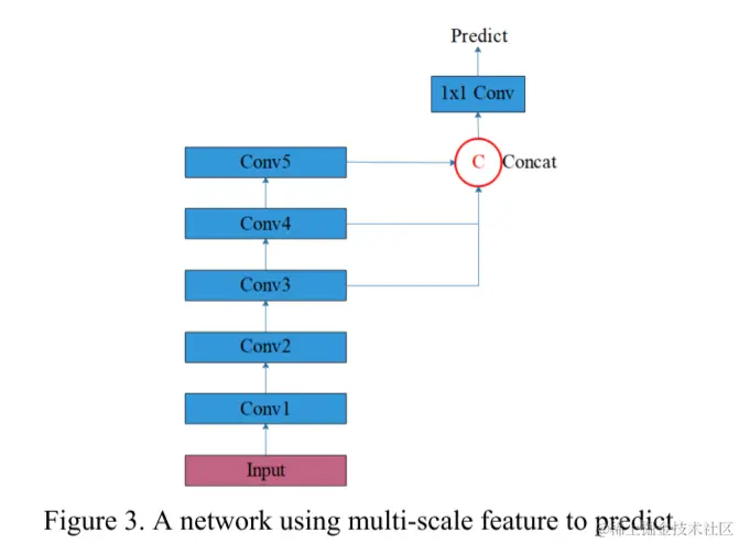 时间序列预测模型是为了从过去的输入中学习固有模式而设计的。通常,时间序列包含不同的尺度模式,例如,电力需求数据呈现每日重复和每周重复。直观上,不同接收域卷积网络中不同深度的特征层可以重点学习不同的尺度模式。受多尺度目标检测网络的启发,与其只使用最后一层,不如提取多层特征并将它们结合在一起进行预测。为了方便每个feature map在所有层中包含相同的长度,通过跳跃连接可以很容易地完成这种feature的合并,如下图所示。即从不同的层中加入分支,并将它们连接在一起,得到一个包含多尺度特征的层,并对这一层进行1 1卷积,进行预测。