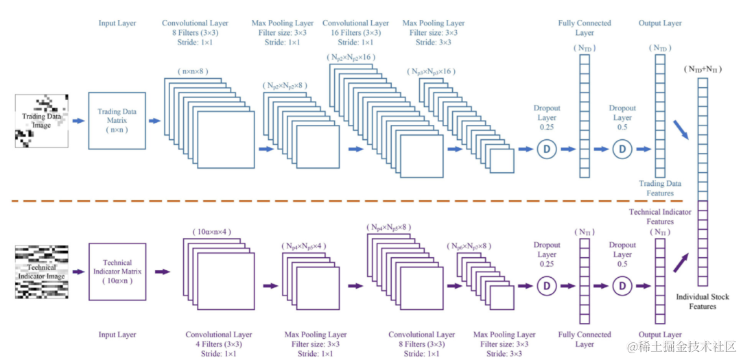 交易数据图像和技术指标图像都使用了输入层、两个卷积层、两个最大池化层、两个dropout层、以及全连接层和输出层进行特征提取。最后,个股特征由交易数据特特征以及技术指标特征组成。